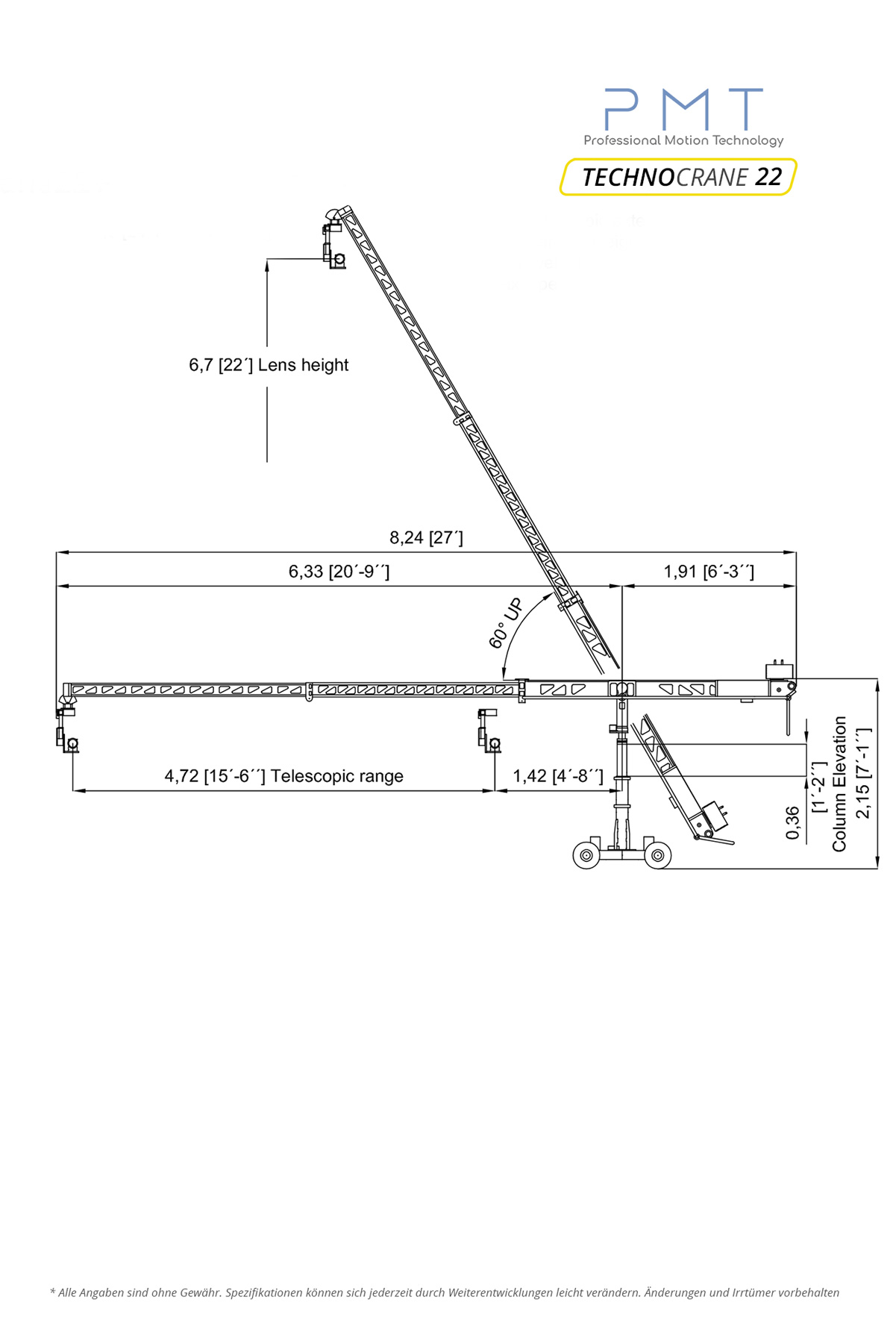 Mit 6,62 Metern maximaler Optikhöhe bei einem Teleskopweg von 4,73 Metern ist der Technocrane 22+ ein flexibel einsetzbares Multitalent, das in Verbindung mit der Schwenkarmsteuerung mühelos von nur einem Operator bedient werden kann.
